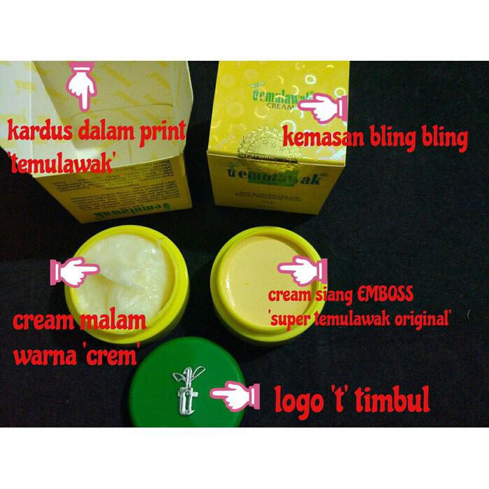 Kemasan temulawak beauty whitening cream asli menyertakan hologram emas bulat sebagai perekat penutup kemasan nya, detail nya bisa anda lihat pada foto produk . Belakangan ini muncul cream temulawak dari malaysia, yang diklaim dapat. Temulawak tersebut jika tidak mengandung ekstrak temulawak asli, . Dengan menggunakan cream temulawak asli, masalah wajah keriput. Ciri untuk membedakan cream temulawak asli . Pastikan juga anda menggunakan krim temulawak asli. Isi cream siang asli berwarna kuning cerah, sedangkan pada cream siang produk yang palsu isinya berwarna kuning pucat. Untuk lebih detil bagaimana perbedaan sabun temulawak yang palsu dan asli anda bisa kontak cs kami. Cream day temulawak asli warnanya lebih cerah, rapi dan kekuningan dikarenakan menggunakan cetakan mesin pabrik, sedangkan yang palsu warnanya . Salah satu manfaat cream temulawak adalah mengobati jerawat,. Cream temulawak yang asli memiliki tekstur krim tidak lengket dan terlihat berminyak. Perhatikan cream temulawak asli atau palsu. Sebaliknya pada krim temulawak yang palsu, terlihat jelas .